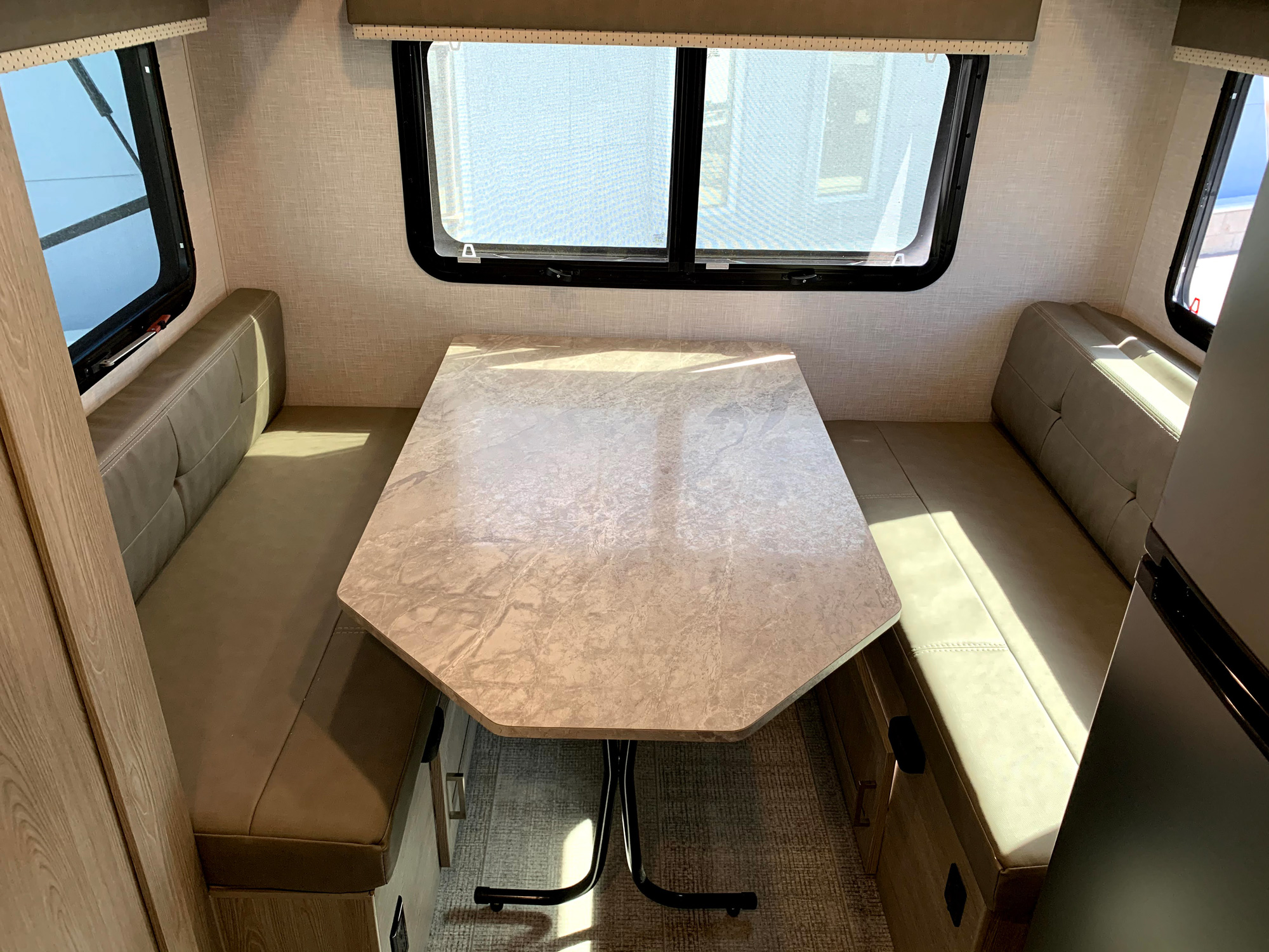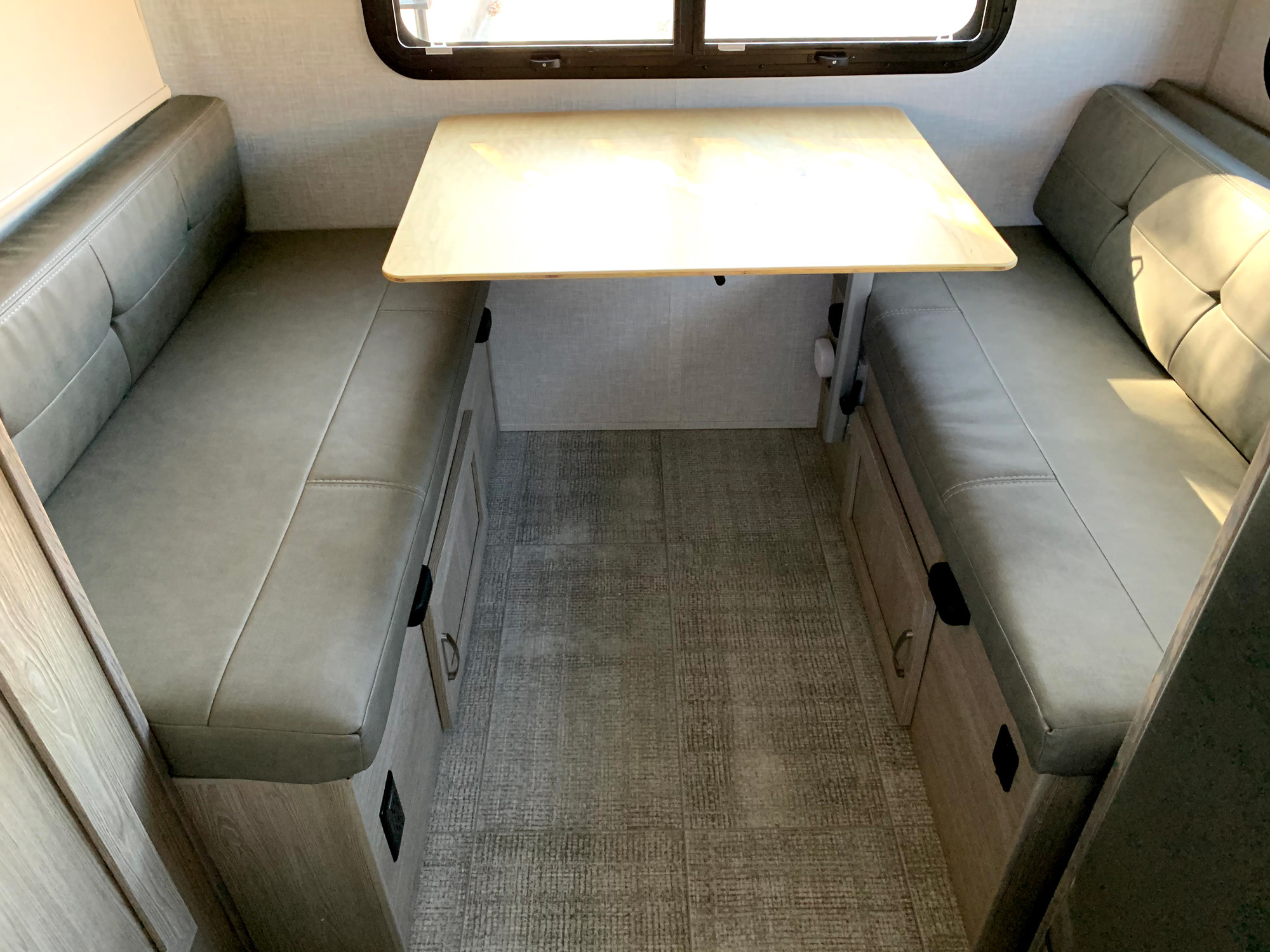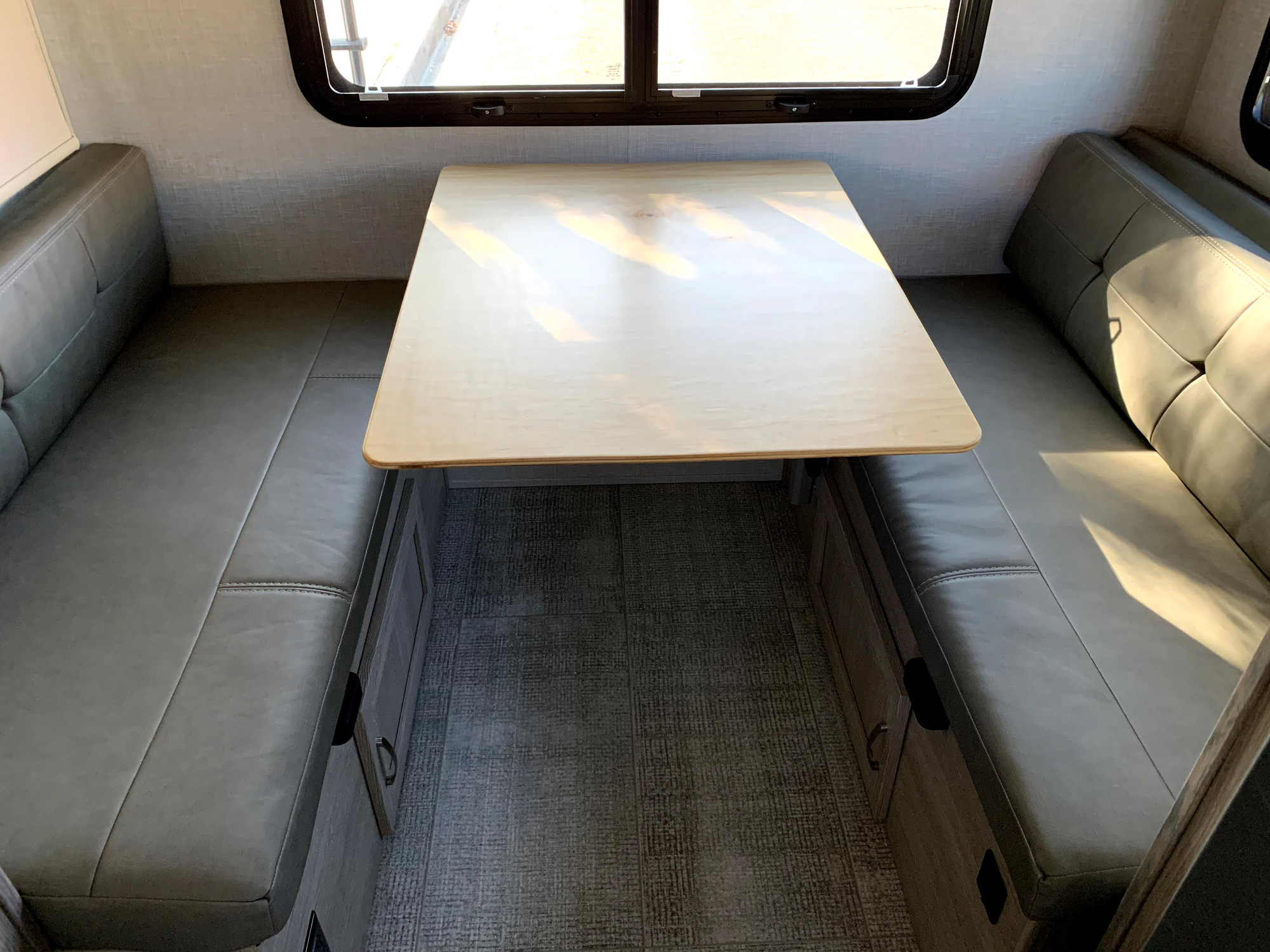 The standard dinette table in the Geo Pro G19RD is designed to convert into a full bed. It is 52″ long 31.25″ wide which takes up a lot of space in the rear of the trailer. It can be difficult to sit on both sides of the dinette. The table has to be slid from one side to another to squeeze in & we are not big people. So we decided to install a different table when we do not need to convert the dinette into a bed.