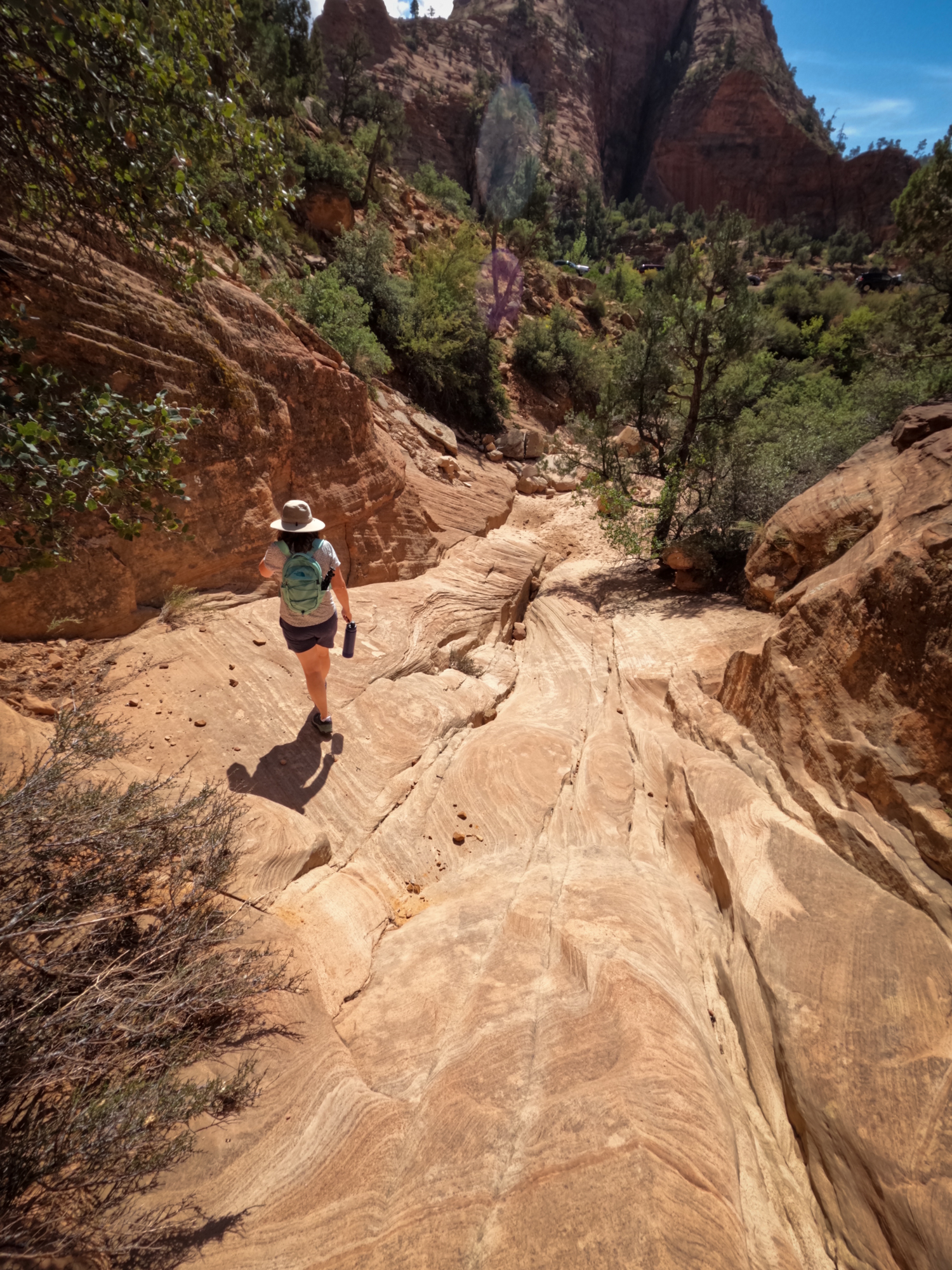 We found a path down into the start of the canyon next to the road that appeared to be the start of the trail. Using the Alltrails app on my phone, we followed the footpath along the canyon bed and appeared to be on trail. But after about 1/4mi, we hit a dead end or a recent rockfall that clogged the canyon. We scrambled over the first slab incline but boulders blocked the canyon. Either we were not on the trail, needed to scramble over these boulders to where the trail flattened or there had been a recent collapse into the canyon. I could not see any obvious way around and the height of the scramble was more than we wanted to try. So our Shelf Canyon Trail hike was short. According to Alltrails, the trail leads into a slot canyon but we were unable to make it past the boulders. It’s possible the ‘real’ trail was higher up along the canyon wall but no trail was obvious. We were low on water so headed back. There is no running water at the rest-stop or Zion Canyon Overlook parking lot restroom so bring plenty.