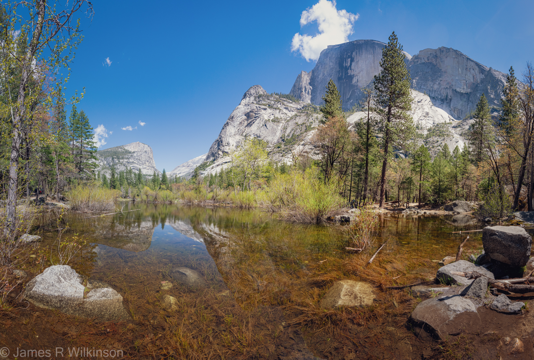 When Carol & I visited Mirror Lake in July 2022, the water level was really low. It was hard to find a reflection in the water during that visit as we cooled off in the shallow lake under Half Dome. This trip, all the waterfalls were flowing full volume and the lakes, rivers, and creeks were cold & clear. There were waterfalls on every cliff wall with snow melt flowing in every crevice.